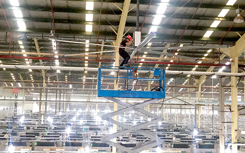 经过多方考察找到了具有17年数控厂降温通风经验的翰泰环保,我司安排专业的工程师免费上门勘察现场,最终决定使用扇机组合(即直径为7.3米的翰泰通工业大风扇和环保空调)方式来解决谊科厂房的环境问题,整个设计方案为整体送风,达到车间整体的降温、通风、换气,增加空气含氧量,效果显著,让员工走到哪都能感受到清新、凉爽、舒适的空气。保障了员工的身心健康,提高了企业的生产效率。