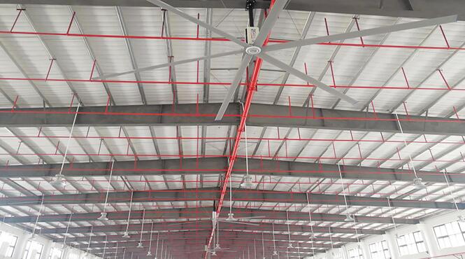 这些问题的根源,其实就是铁皮房车间的降温通风没有做好,那么怎么来给铁皮房降温呢?答案是安装工业大风扇!我们说的工业大风扇可不是传统的牛角扇或者家里用的小吊扇,而是直径超过7米的大型吊扇,它的风力覆盖面积很大,可以超过1800平方米,通常一个中小型的铁皮房车间安装个两三台就够了。工业大风扇通过扇叶的缓慢转动,加快空气流动,把铁皮房车间内部的热量排出,很好的解决了通风降温问题。而且因为工业大风扇是采用吊顶安装的方式,它不会影响到地面的工作岗位。