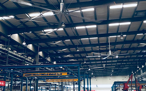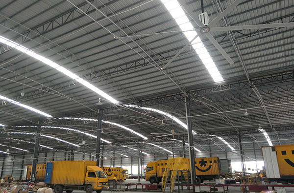 为了有效改善员工工作环境,增加工厂的生产效益,采用工业大风扇为橡胶车间通风降温,利用风扇巨大扇叶缓慢旋转,将清新、凉爽、干净的空气带入室内,同时把车间内高温闷热异味的气体排出,从而改善车间内部空气循环和空气质量。